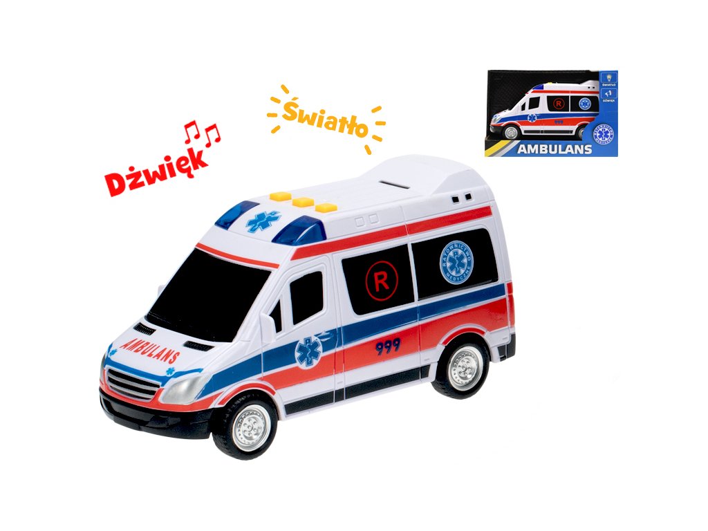 Záchranka spěchá k pacientovi! Model ambulance v polském designu o délce 18 cm má pohon na setrvačník a funkční světla a zvuky. Doporučený věk dle výrobce. Pro zprovoznění jsou potřeba baterie (nejsou součástí balení).