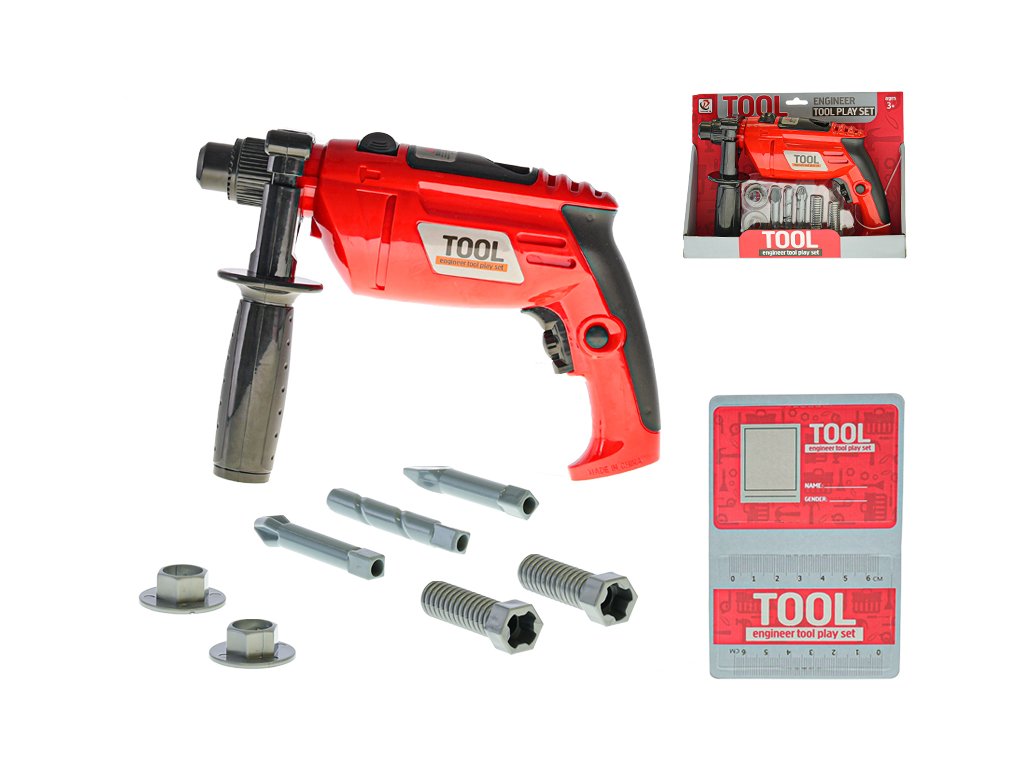 Pro pořádnou práci v dílně! Tato 22 cm velká červená vrtačka se otáčí a vydává zvuky jako opravdová. Sada obsahuje i výměnné nástavce. Doporučený věk dle výrobce. Pro zprovoznění jsou potřeba baterie (nejsou součástí balení).Doplňkové parametry