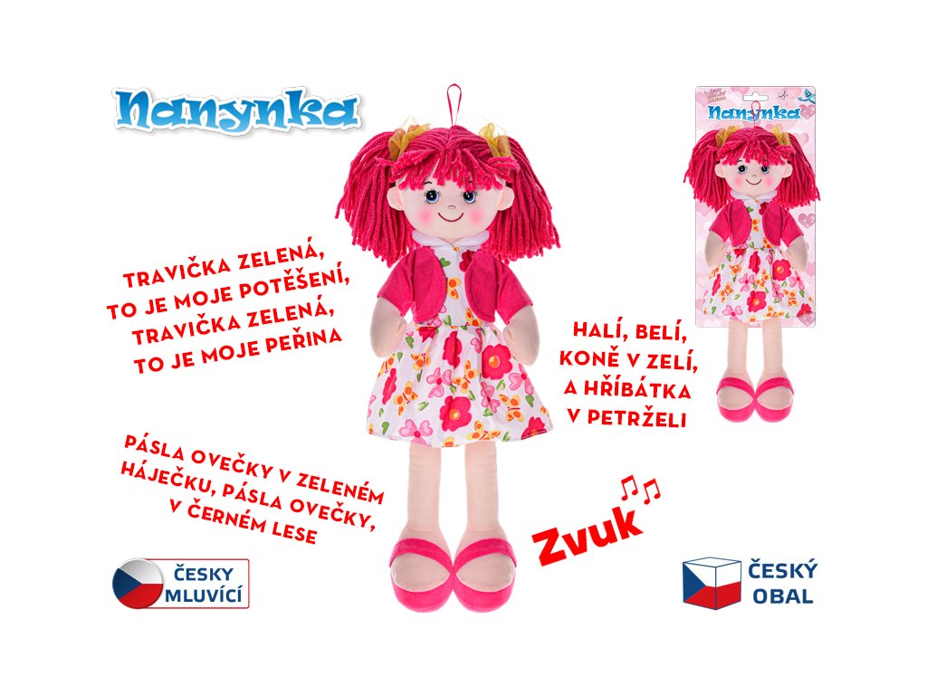 Nanynka v červených šatech se těší na nové písničky! Velká, 50 cm panenka s měkkým tělem je ideální na objímání. Po stisknutí mluví a zpívá v češtině. Bezpečná již od narození (0m+). Pro zprovoznění jsou potřeba baterie (nejsou součástí balení).Doplňkové parametry