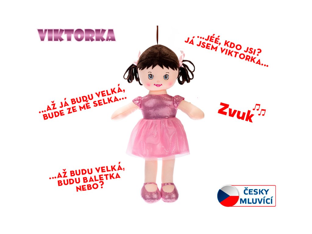 První kamarádka do postýlky! Viktorka je 32 cm velká, extra měkká hadrová panenka, která po stisknutí bříška mluví česky. Je lehká a bezpečná již od narození (0m+). Pro zprovoznění jsou potřeba baterie (nejsou součástí balení).Doplňkové parametry