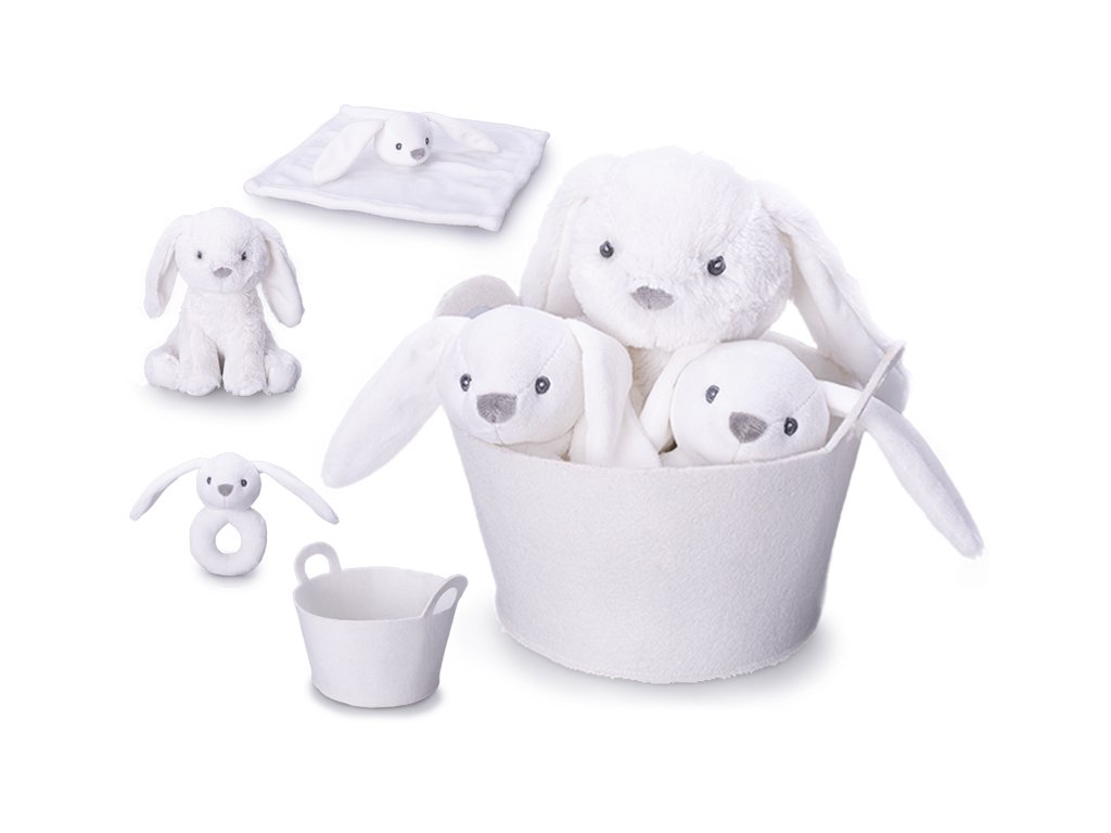 Přivítejte miminko na světě s tím nejněžnějším dárkem! Tento elegantní bílý set v košíku obsahuje 20 cm sedícího zajíčka, 13 cm chrastítko a měkoučkého usínáčka. Vše je certifikováno a bezpečné již od narození (0m+).Doplňkové parametry