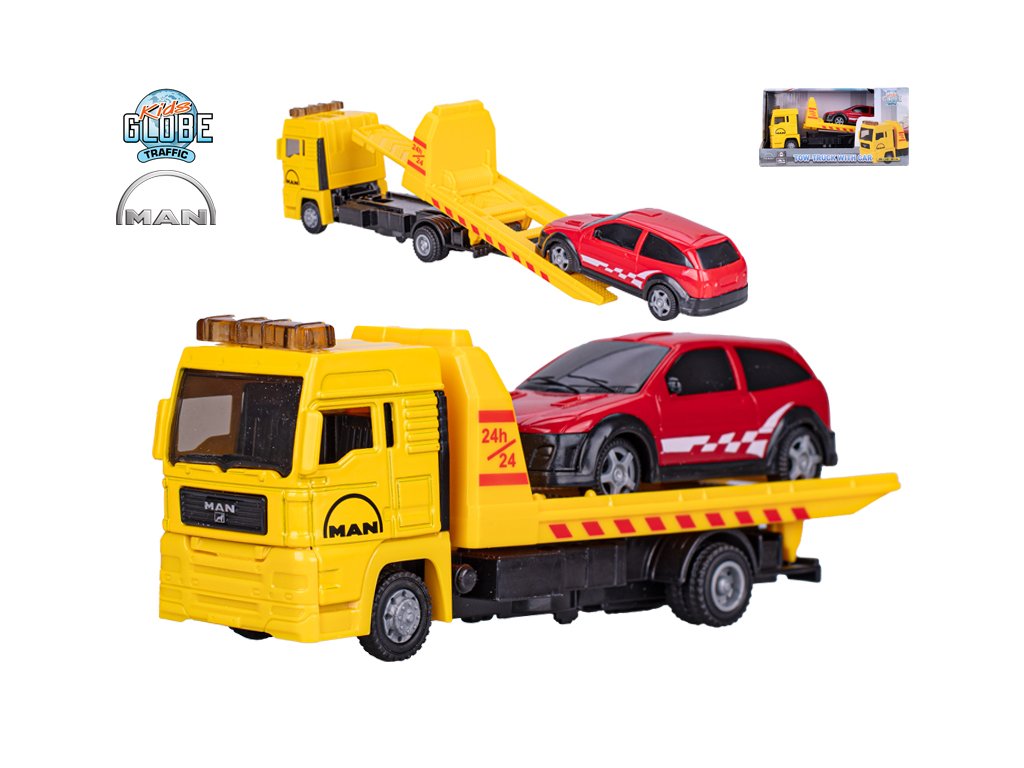 Nehoda na silnici? Žádný problém! Kovová odtahovka MAN (19 cm) s pohyblivou plošinou odveze naložené osobní auto (10,5 cm).