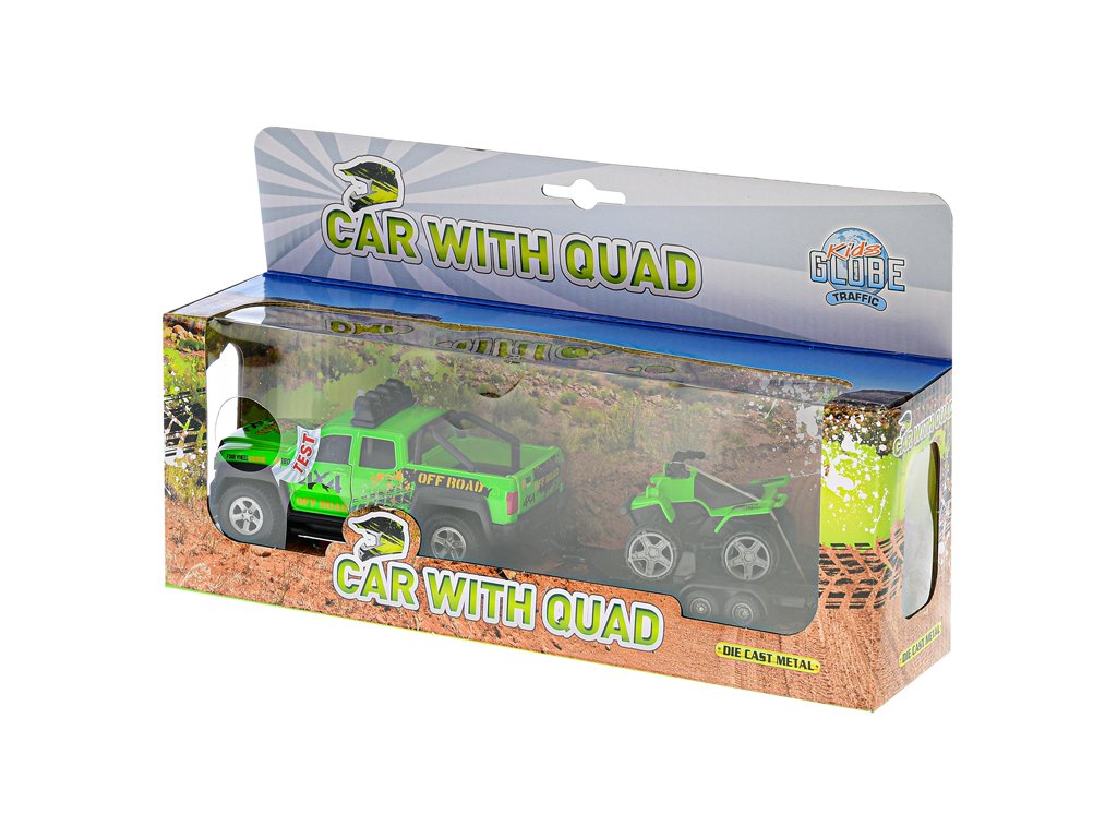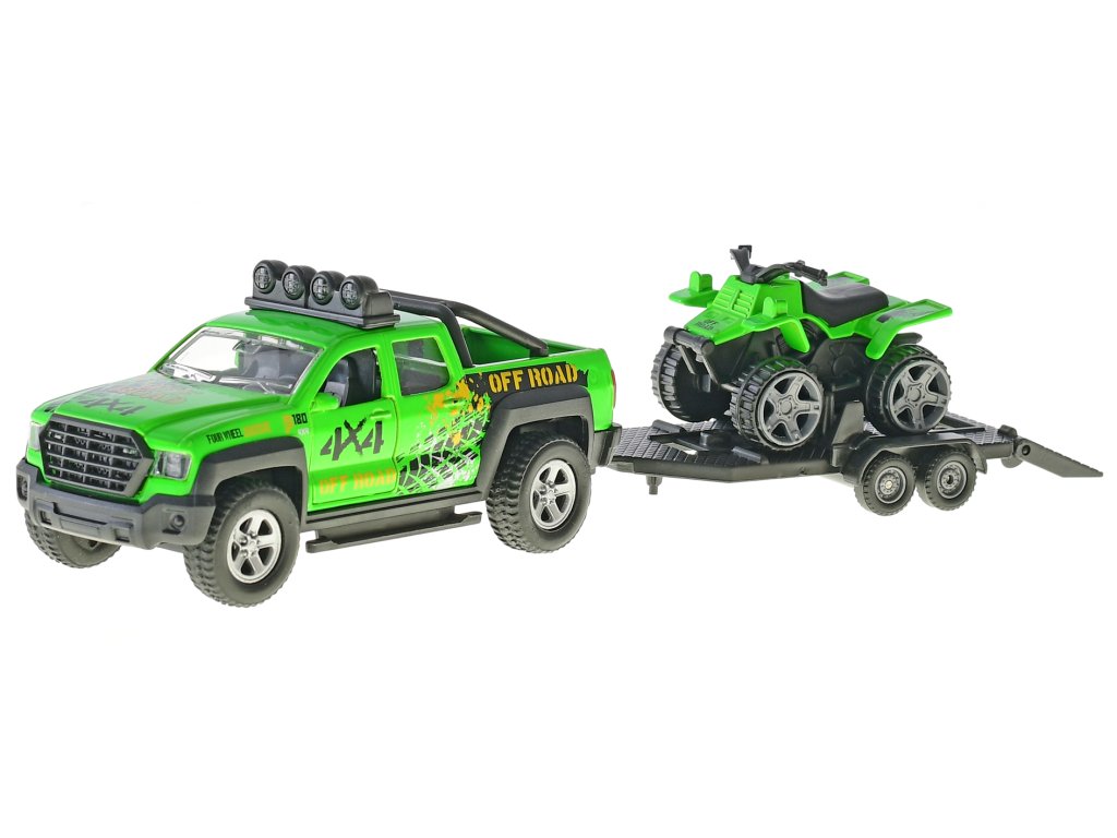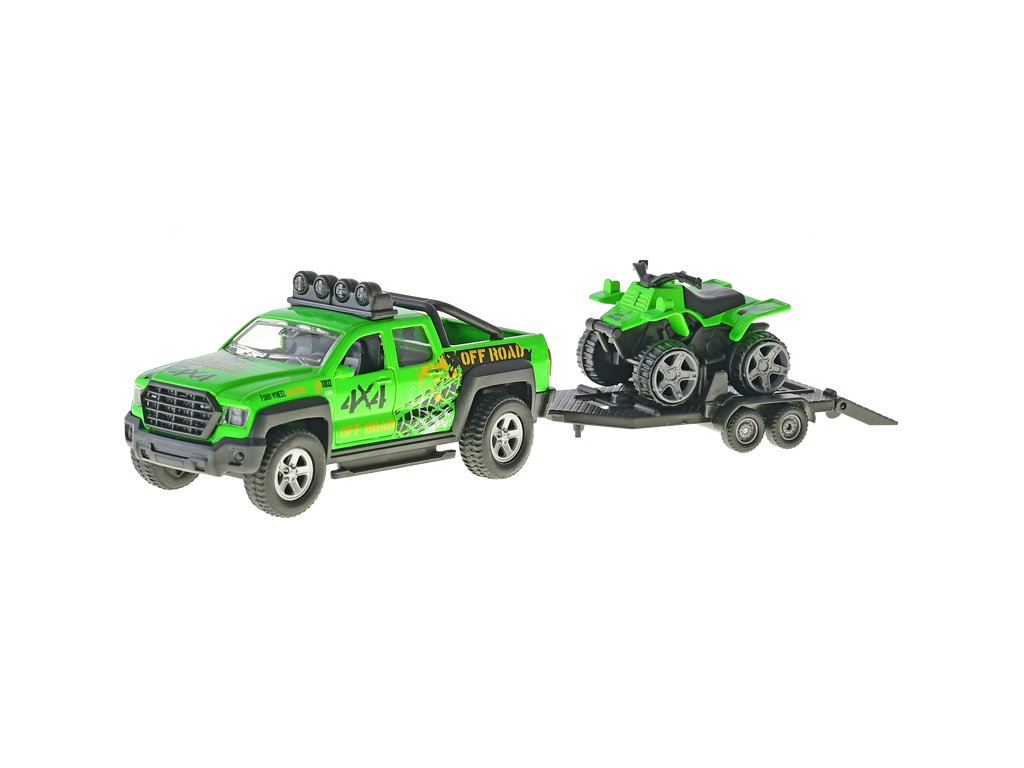 Dobrodružství v terénu může začít! Sada obsahuje 13 cm kovové auto na zpětný chod se světly a zvukem, které na přívěsu veze terénní čtyřkolku. Pro zprovoznění jsou potřeba baterie (nejsou součástí balení).Doplňkové parametry