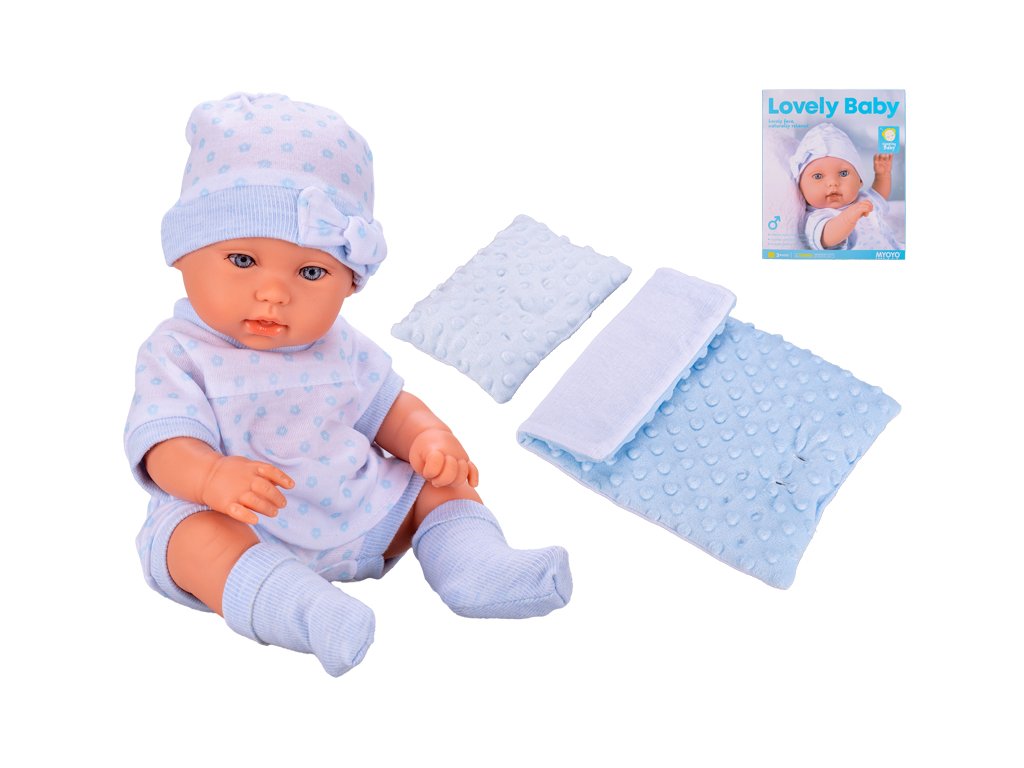 Uložte miminko ke spánku! Tato 33 cm velká panenka s tvrdým tělíčkem v modrém oblečení je dodávána s měkkými peřinkami. Ideální pro hru na rodiče a péči o miminko.Doplňkové parametry