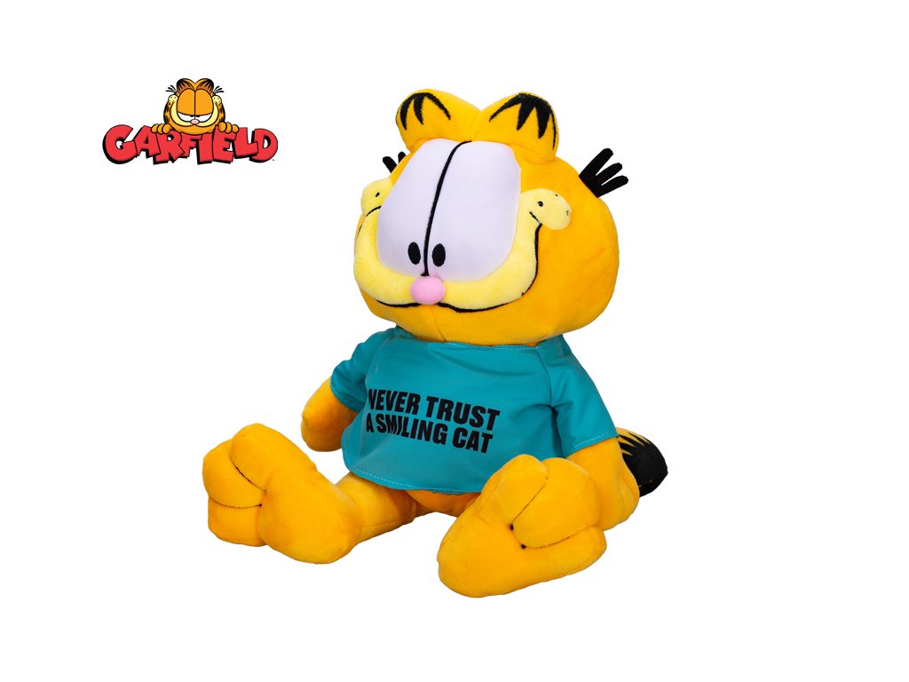 Moudro od samotného mistra! Tento 28 cm vysoký plyšový Garfield s nápisem "Never trust a smiling cat" je vtipným doplňkem. Jeho šibalský úsměv z něj dělá neodolatelného společníka. Bezpečný od narození (0m+).Doplňkové parametry