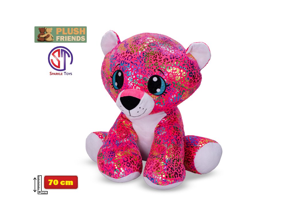 Oslnivá šelma v barvách duhy! Tento obří, 70 cm vysoký sedící leopard z kolekce Star Sparkle má nádherný duhový kožíšek se třpytivými detaily. Bezpečný pro děti od narození (0m+).Doplňkové parametry