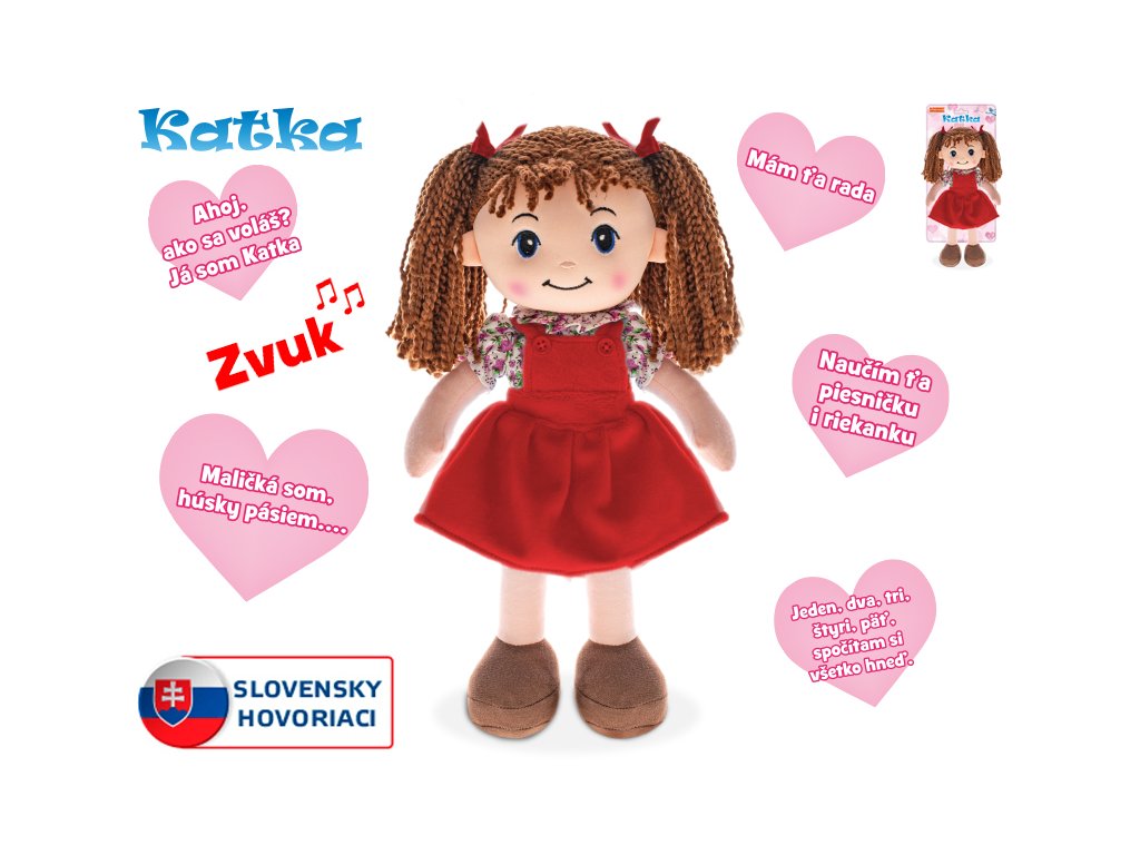 Interaktívna kamarátka pre slovenské dievčatká! Hnedovlasá Katka je 39 cm vysoká bábika s mäkkým telom, ktorá hovorí a spieva po slovensky. Bezpečná už od narodenia (0m+). Pre sprevádzkovanie sú potrebné batérie (nie sú súčasťou balenia).Doplňkové parametry