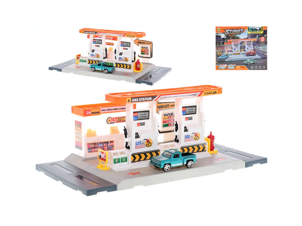 Natankujte a vyrazte na cestu! Sestavte si vlastní benzinovou stanici (34x17 cm) z 24 dílků. Sada obsahuje i 7 cm kovové autíčko a další doplňky.Doplňkové parametry
