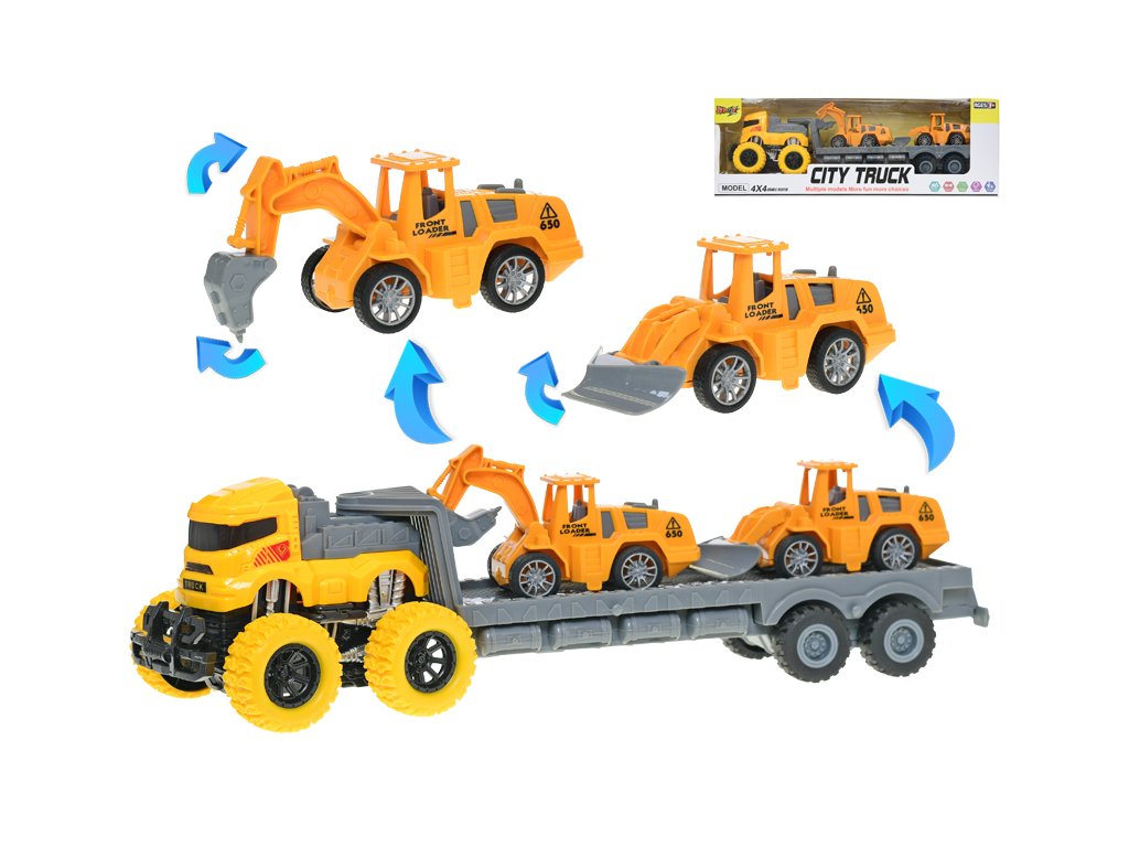 Přepravte těžkou techniku na stavbu! Velký, 37 cm dlouhý tahač na setrvačník veze na svém návěsu 2 stavební vozidla (13 cm) na zpětný chod. Kompletní sada pro malé logistiky.Doplňkové parametry